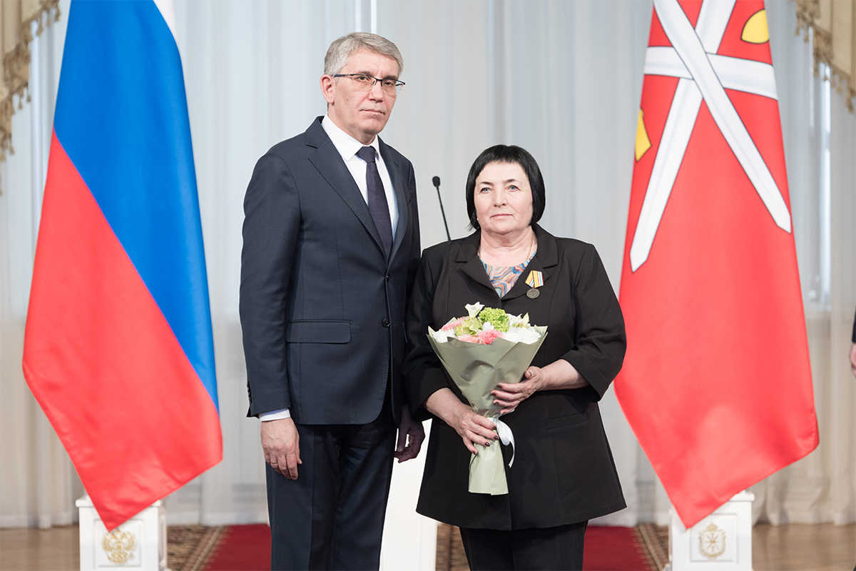 В колонном зале Дома Дворянского собрания губернатор Дмитрий Миляев вручил награду председателю Общественного совета Дубенского муниципального округа, социальному координатору инициативной группы «Дубна для CVOих» Галине Кызиной.