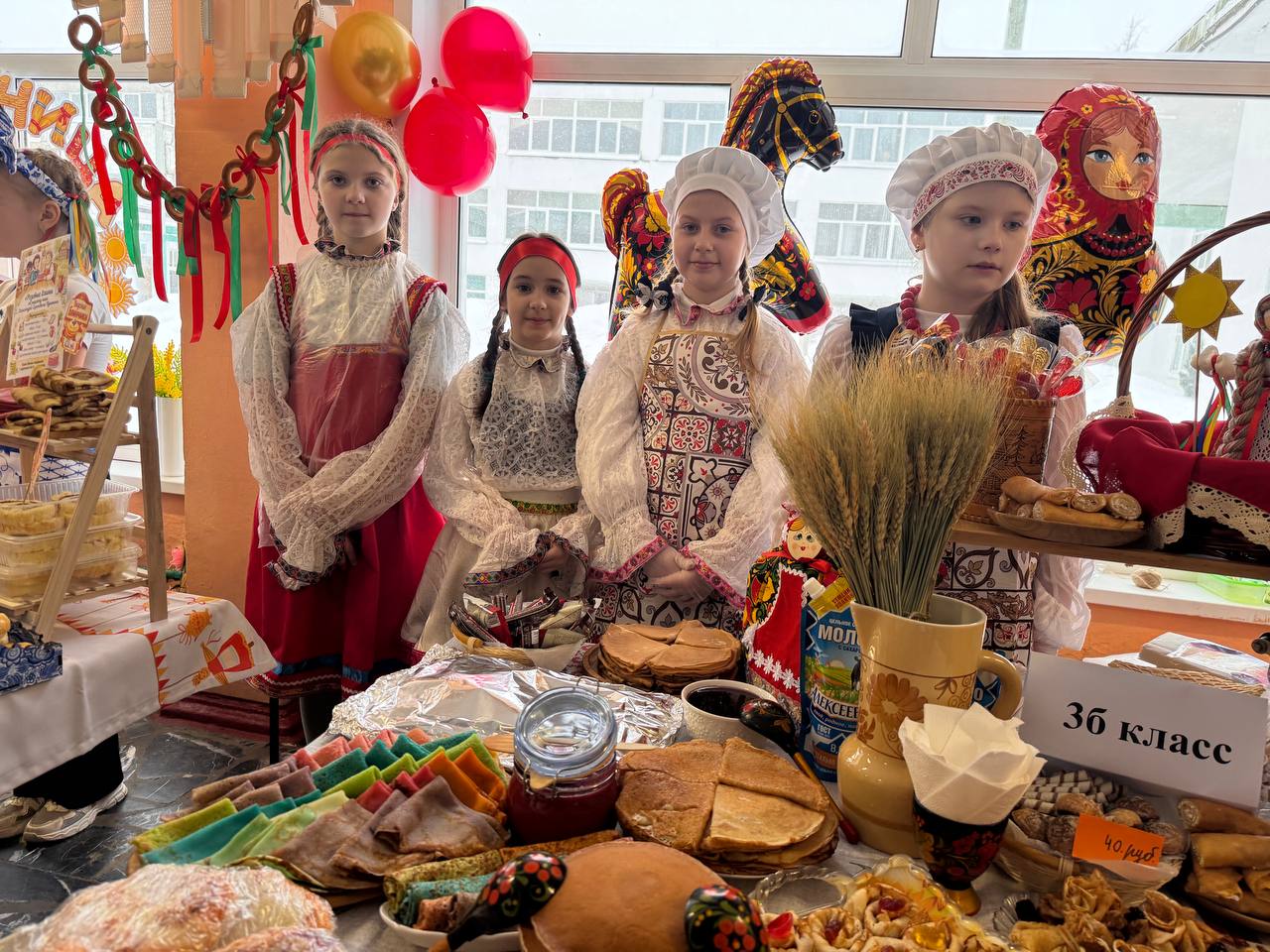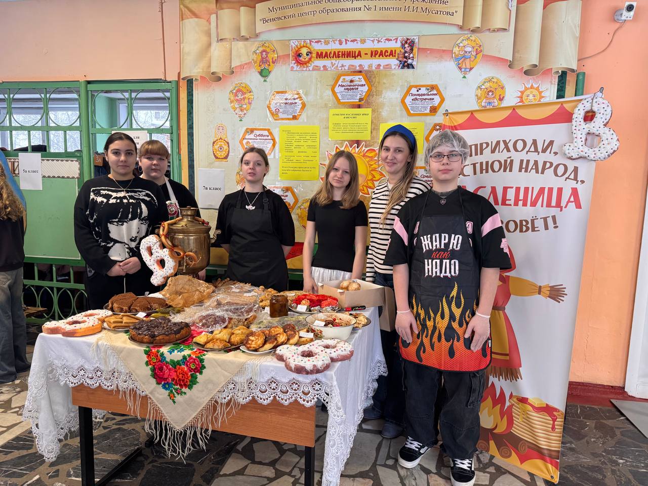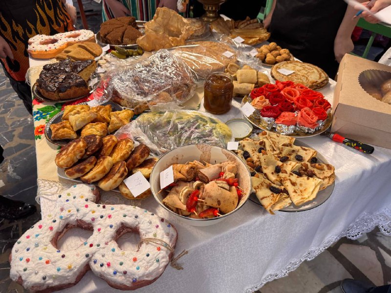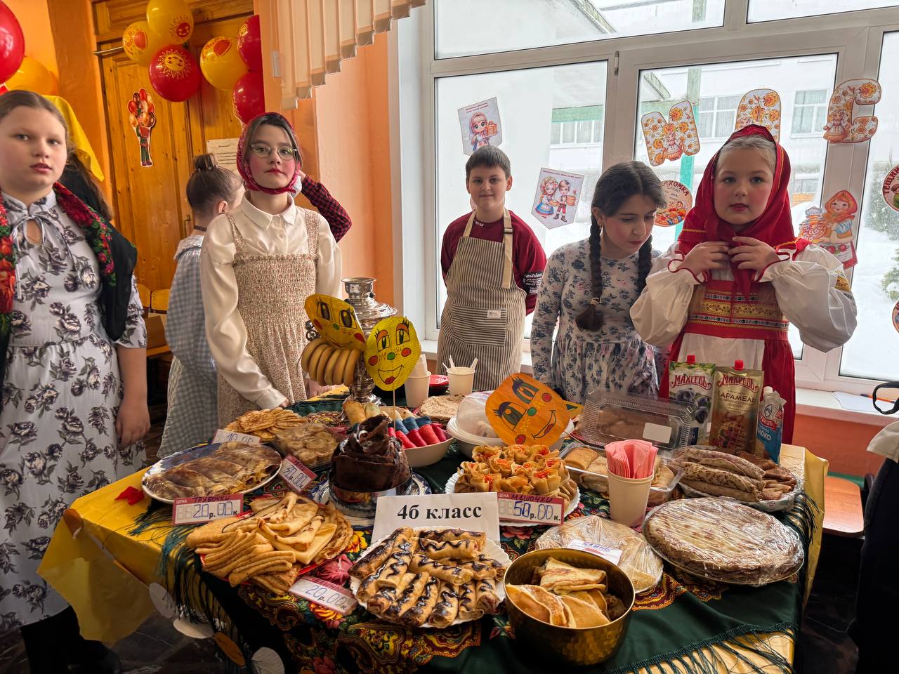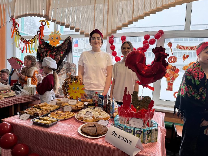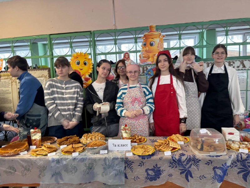 Школьники совместно с учителями и родителями организовали красочные столы с разнообразными угощениями: главное угощение - блины на любой вкус, пироги, леденцы, торты, напитки и многое другое. С каждым годом столы становятся краше, а угощения разнообразнее. Вкусности продавались за небольшую стоимость. Все собранные деньги перечислят в поддержку военнослужащим специальной военной операции.