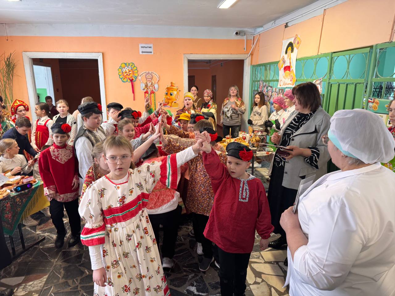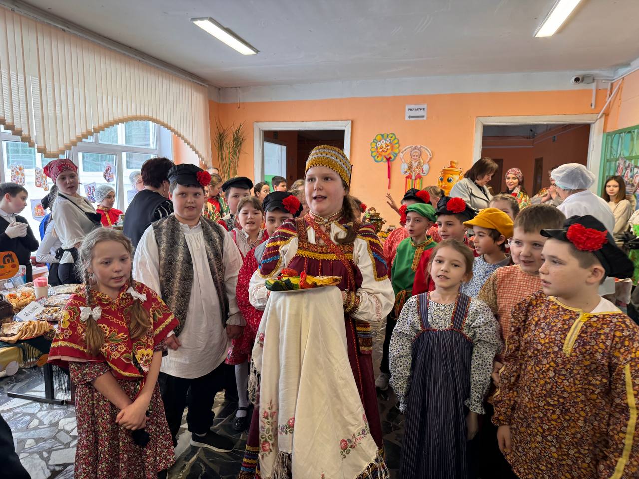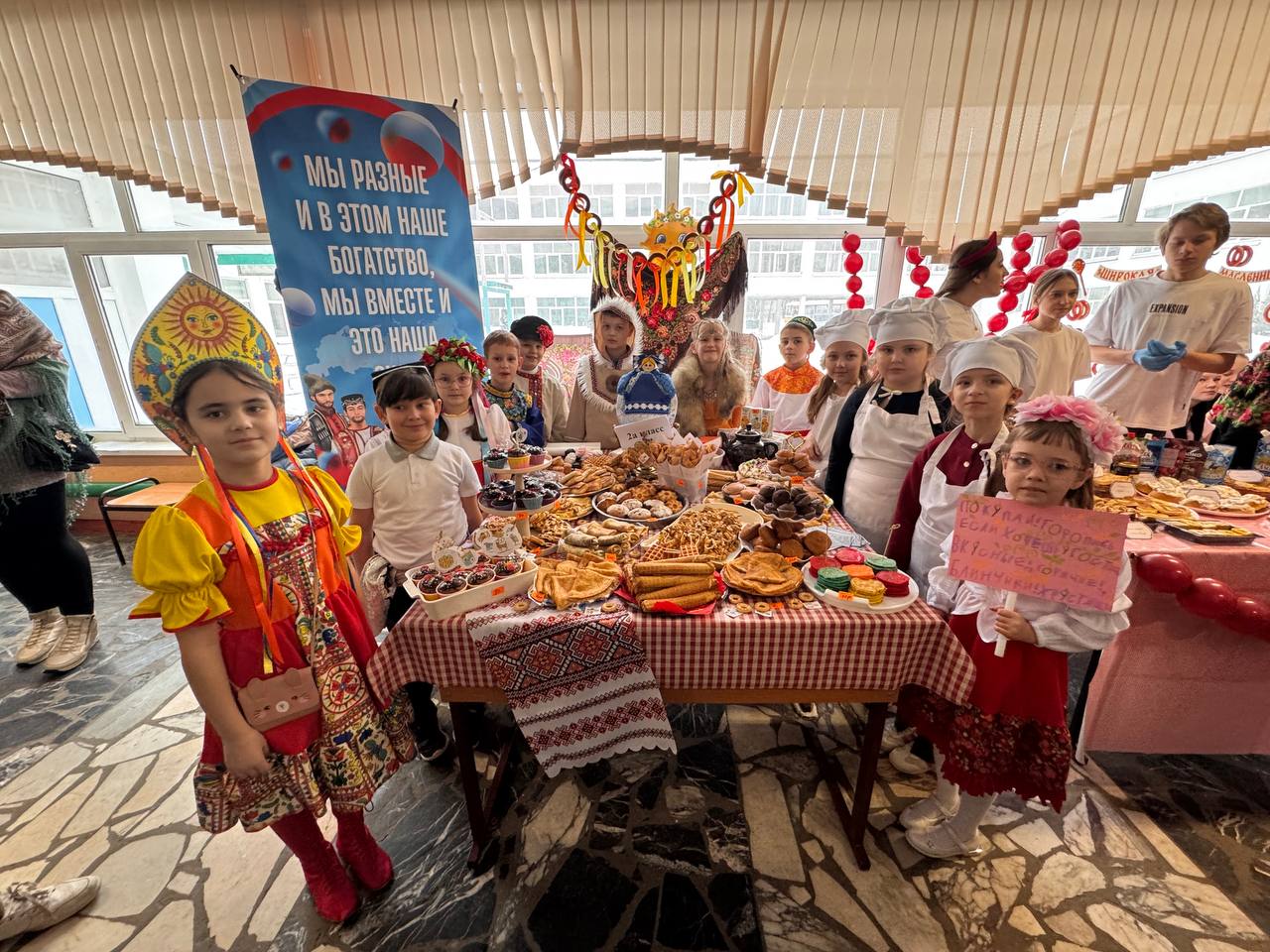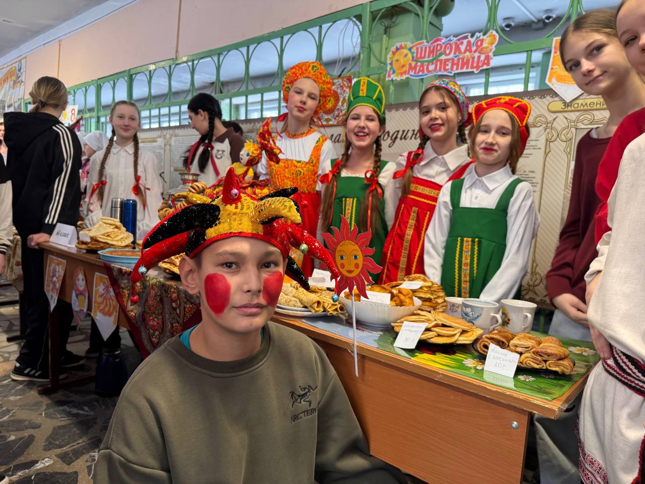 Школьники совместно с учителями и родителями организовали красочные столы с разнообразными угощениями: главное угощение - блины на любой вкус, пироги, леденцы, торты, напитки и многое другое. С каждым годом столы становятся краше, а угощения разнообразнее. Вкусности продавались за небольшую стоимость. Все собранные деньги перечислят в поддержку военнослужащим специальной военной операции.