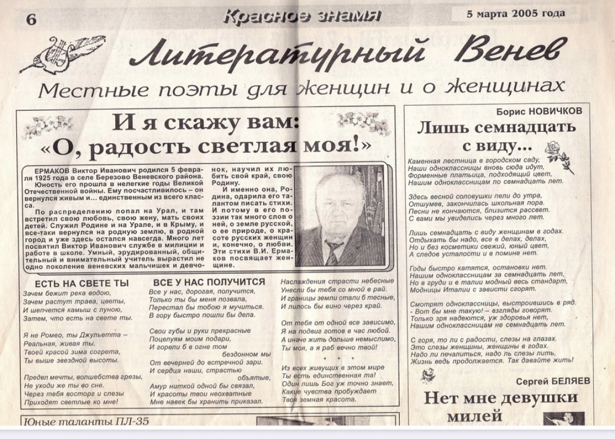 Дар этот в нем обнаружился не случайно, нашим родственником является поэт Федор Тютчев. Дедушкины стихи могли бы достойно украшать толстые журналы, но он приносил их в районную любимую газету «Красное знамя», которую очень уважал и любил. В ней постоянно публиковали подборки или отдельные стихотворения В. И. Ермакова к разным датам. Часть газет хранится в архиве моей семьи.