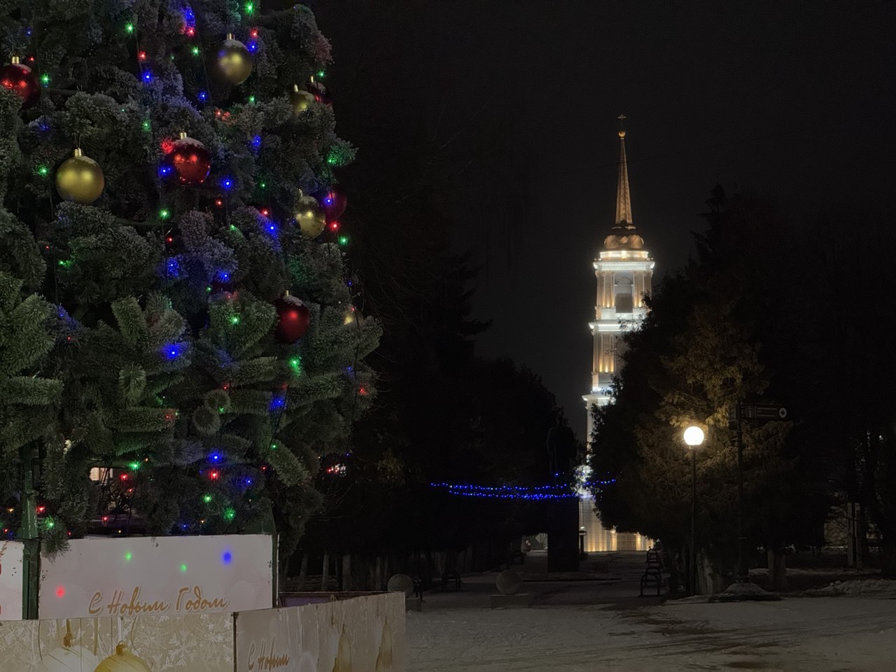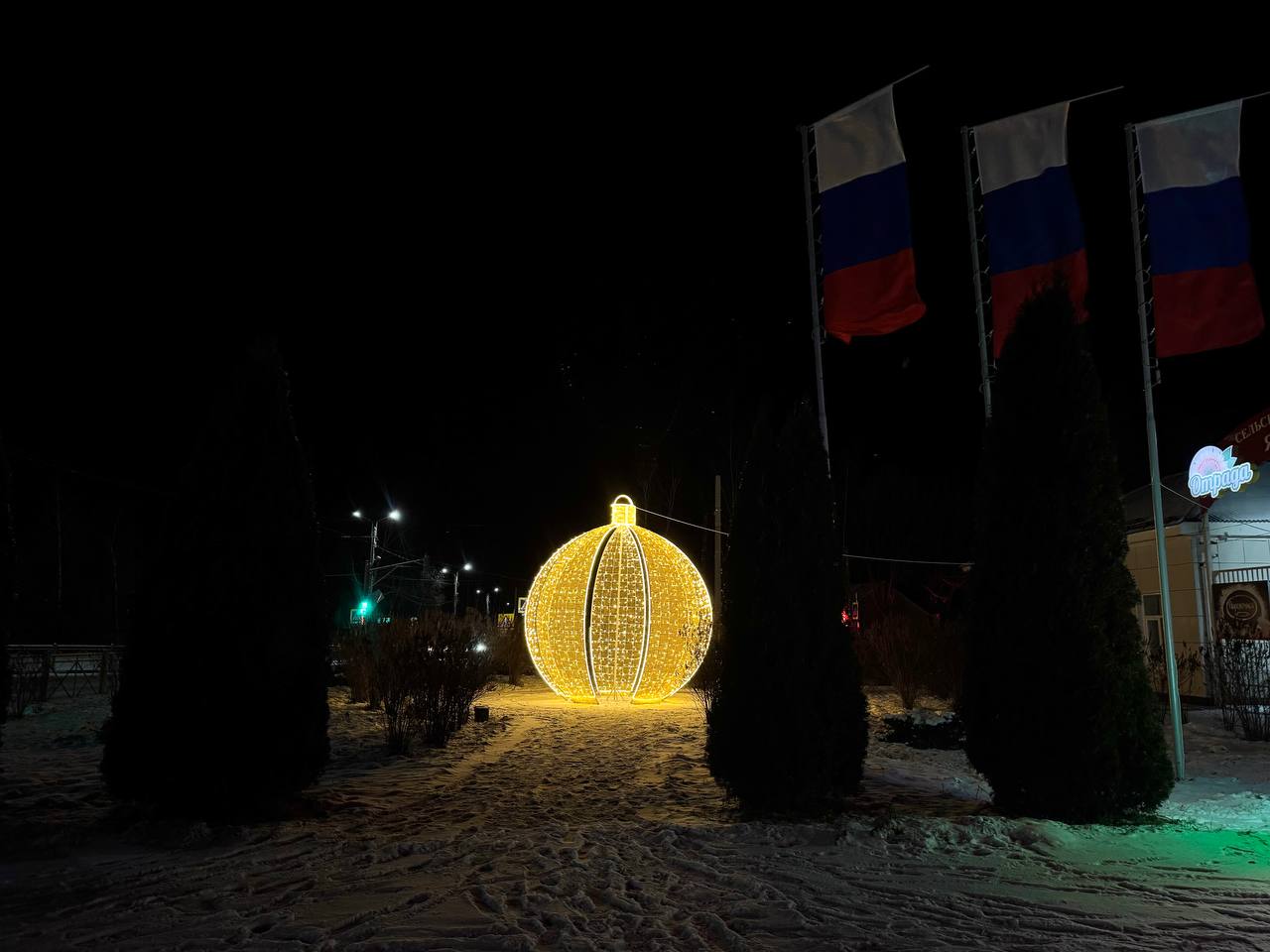 Улицу Стрешнева украшают новые световые композиции и гирлянда вдоль стадиона. На пересечении улиц Бундурина и Пролетарская — новогодний шар.